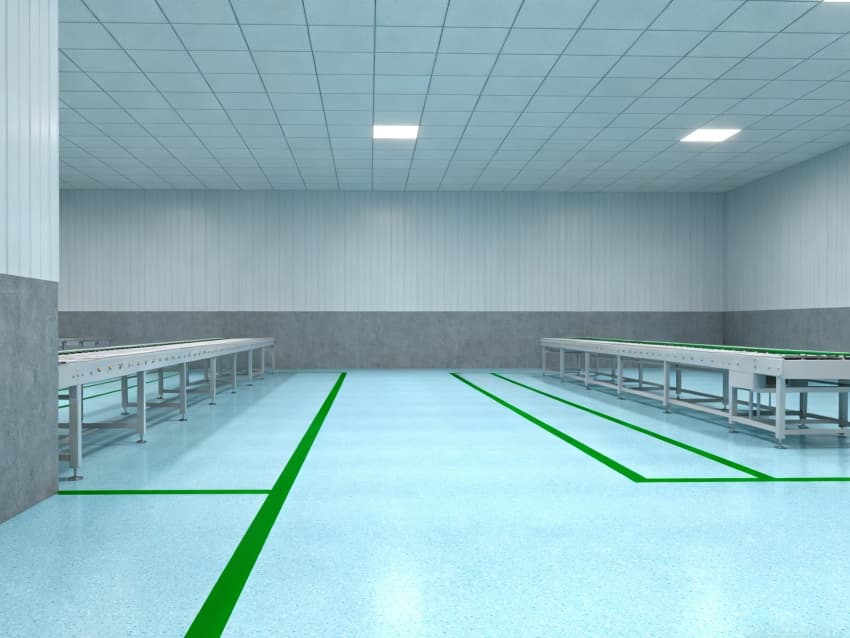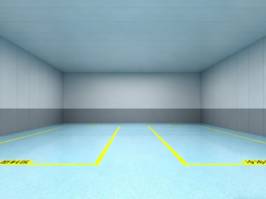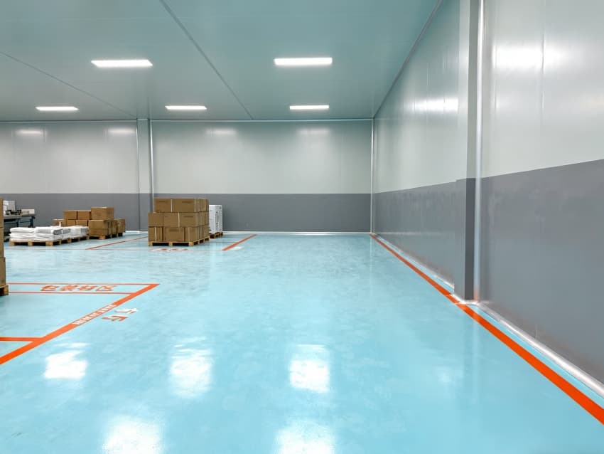 車間統(tǒng)一采用淺藍色耐磨環(huán)氧地面,兼具抗沖擊、易清潔特性,適配鈑金加工、總裝等多環(huán)節(jié)的設(shè)備安裝與物料轉(zhuǎn)運需求;四周灰色防霉墻壁經(jīng)耐污處理,耐磨損且不易顯臟,配合頂部均勻布光系統(tǒng),營造明亮舒適的生產(chǎn)環(huán)境。?