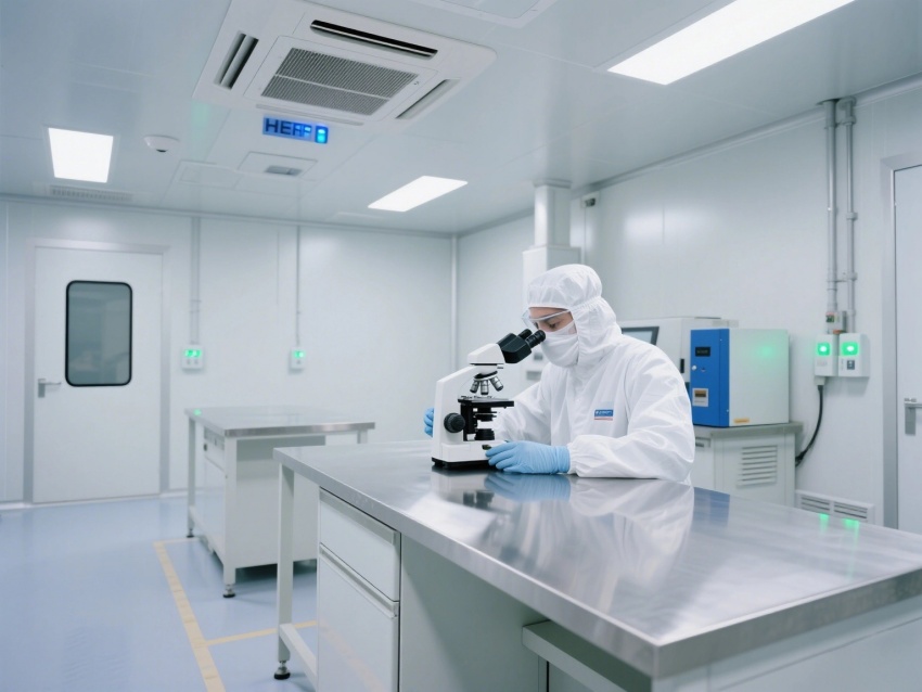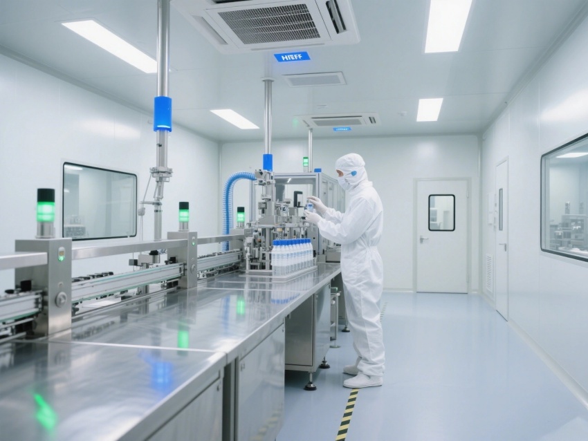 核心區(qū)域可見全封閉式潔凈廠房,墻面與地面采用無縫一體化設(shè)計(jì),避免積塵殘留。多組高效空氣過濾器整齊排列于頂部,通過層流送風(fēng)系統(tǒng)維持Class8級潔凈標(biāo)準(zhǔn)。?