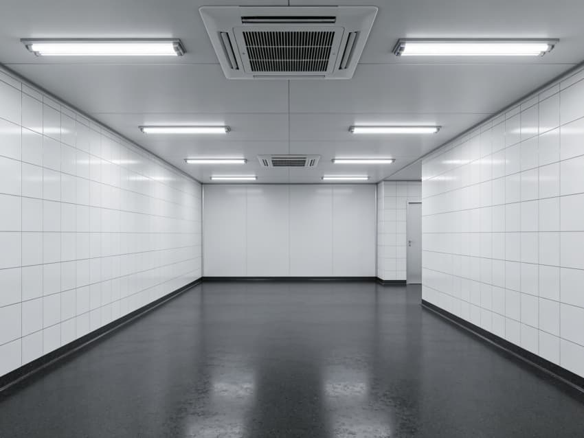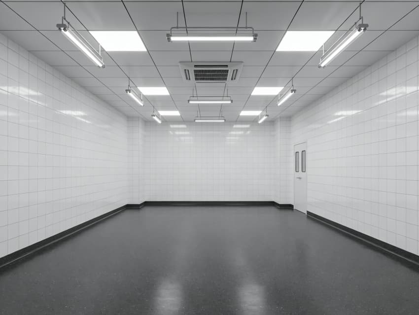 車間內(nèi)部施工工藝凸顯耐腐潔凈特性:地面采用深灰色重防腐環(huán)氧自流平工藝,經(jīng)基層噴砂處理、防腐底漆涂刷、環(huán)氧砂漿找平、自流平罩面四道關(guān)鍵工序,表面平整度誤差≤1mm/m,耐酸堿、耐有機溶劑腐蝕,附著力達(dá)2.0MPa以上;墻面采用白色食品級潔凈抗菌涂層施工,推行無縫拼接技術(shù),陰陽角采用R50圓弧倒角工藝,杜絕積塵死角,涂層硬度達(dá)2H,可耐受高頻次消殺。