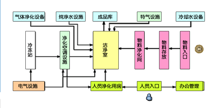 LED/液晶/線(xiàn)路板潔凈無(wú)塵室除了要完成上述的功能、目的外,因?yàn)橹圃爝^(guò)程中工藝生產(chǎn)設(shè)備都是在潔凈無(wú)塵室內(nèi)操作的,以供生產(chǎn)工藝機(jī)臺(tái)使用,潔凈無(wú)塵室與各系統(tǒng)關(guān)系如下: