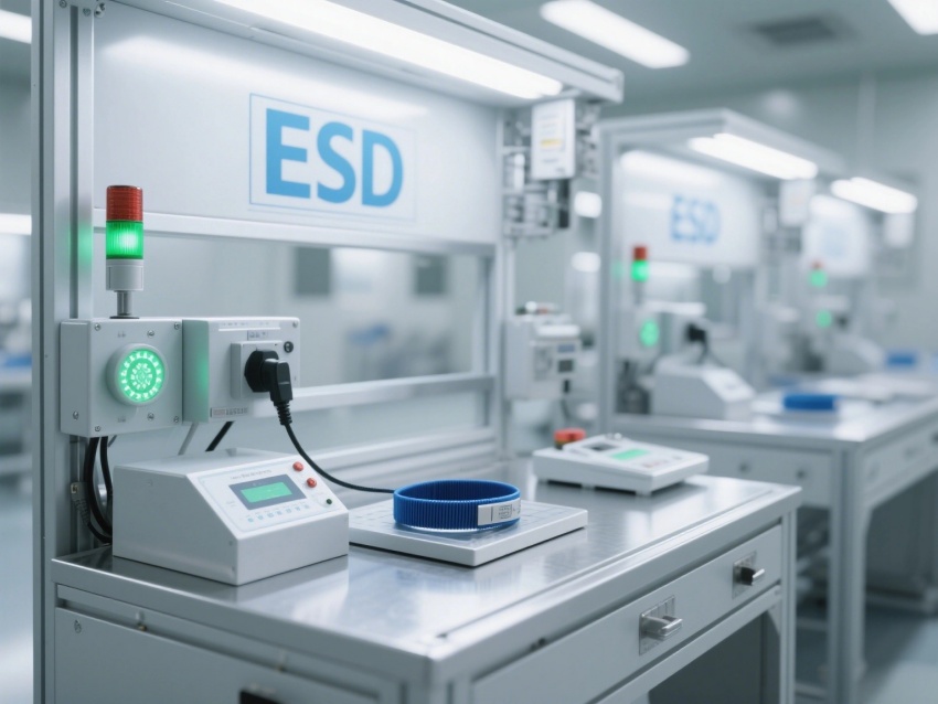 核心區(qū)域可見百級潔凈度的光刻車間,頂部密布FFU風(fēng)機過濾單元,通過垂直層流控制微粒濃度(≤0.3μm顆粒每立方米<100個)。操作臺采用防靜電材質(zhì),配備離子風(fēng)扇消除靜電干擾。?