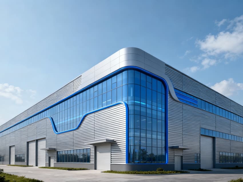 廠房外立面采用淺藍漸變金屬幕墻與光伏一體化組件結合設計,橫向線條舒展流暢,主立面嵌入大尺寸雙層中空玻璃,引入自然光線的同時降低能耗;入口區域以簡約的光伏板陣列造型點綴,直觀傳遞新能源產業特征,整體呈現輕盈、環保的視覺質感。?