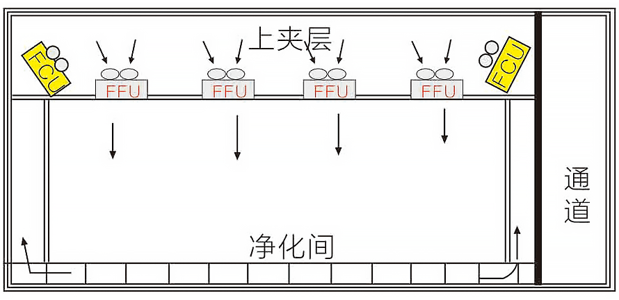 2、單夾層、集中送風、上夾層為靜壓箱.