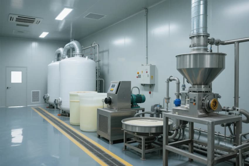 整個車間以白色為主色調,營造出干凈、整潔的氛圍。地面采用了光滑的白色瓷磚,便于清潔和維護。車間內的門和門框大多是不銹鋼材質,顯得堅固且易于清潔。 車