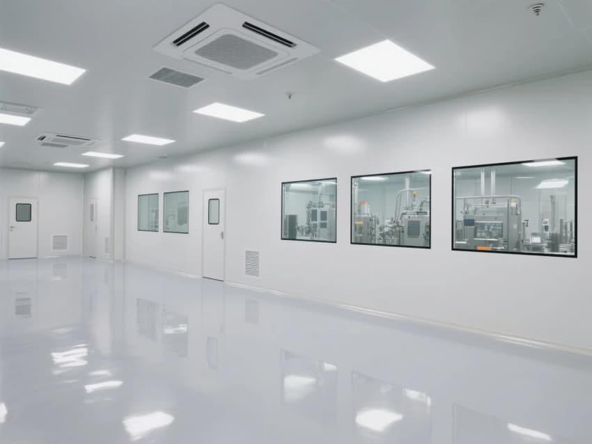 該潔凈車間采用國際標(biāo)準(zhǔn)的萬級無塵環(huán)境設(shè)計,以高級灰與純白為主色調(diào),營造出嚴(yán)謹(jǐn)、高效的工業(yè)美學(xué)。墻面采用抗靜電金屬夾芯板,表面經(jīng)納米涂層處理,兼具防塵與耐腐蝕性能。防靜電環(huán)氧樹脂地坪無縫鋪設(shè),電阻值嚴(yán)格控制在10^6~10^9Ω,確保精密電子元件生產(chǎn)過程中的靜電防護(hù)。