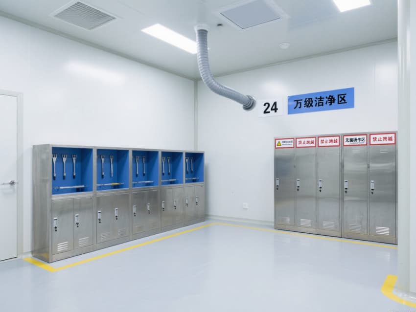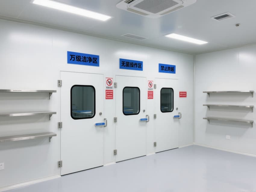 空間內配備不銹鋼潔凈門窗與雙扉傳遞窗,均采用高氣密性密封結構;嵌入式LED潔凈燈提供300-500lux均勻照明,無眩光設計保障操作精度。恒溫恒濕系統(tǒng)精準控制溫度(20-24℃)、濕度(45-60%),藍色功能標識線清晰劃分操作動線,全方位營造安全、穩(wěn)定的萬級無菌環(huán)境。