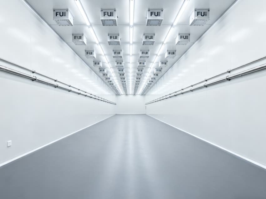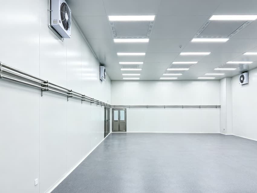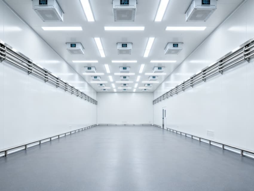 內(nèi)部6個(gè)生產(chǎn)車間均為無(wú)設(shè)備空曠布局,按百級(jí)潔凈標(biāo)準(zhǔn)建設(shè):地面鋪設(shè)防靜電環(huán)氧自流平,墻面采用無(wú)顆粒潔凈彩鋼板,陰陽(yáng)角做R30圓弧處理杜絕積塵;柱網(wǎng)間距設(shè)為9米,預(yù)留光刻機(jī)、晶圓檢測(cè)設(shè)備等重型設(shè)備安裝點(diǎn)位;頂部整合恒溫恒濕系統(tǒng)、高效空氣過(guò)濾器及防頻閃LED照明,所有管線暗藏于吊頂內(nèi),最大化釋放空間高度,為芯片晶圓制造、封裝測(cè)試等核心環(huán)節(jié)提供超潔凈、高穩(wěn)定的專屬生產(chǎn)環(huán)境。