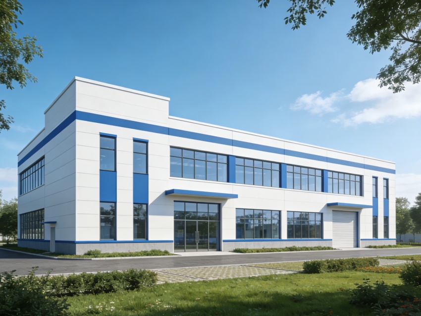 本次呈現的廠房電子光學車間,整體風格簡約專業,精準匹配電子光學器件研發與生產的核心需求。廠房外立面采用淺灰色工業基材搭配大面積高透玻璃幕墻,既保障建筑密封性與隔音性,又為內部車間引入充足自然光,外觀簡潔大氣且兼具工業質感與科技感。均以藍色防靜電潔凈地坪搭配白色無縫潔凈墻面。藍色地面選用高耐磨環氧材質,具備10?-10?Ω防靜電性能,可有效規避靜電對光學元件的損害,表面啞光處理減少光線反射;白色墻面采用環??咕繉?,無縫拼接設計消除清潔死角,搭配嵌入式防眩光照明,營造穩定的視覺環境。