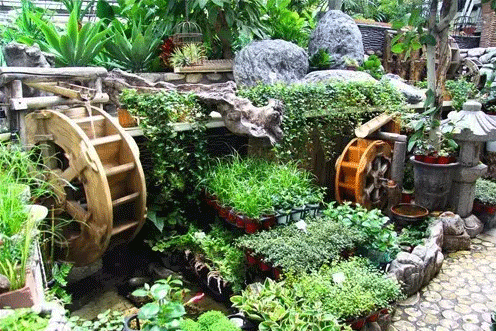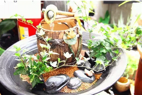 市場內(nèi)銷售水生植物的攤位制作的小水景