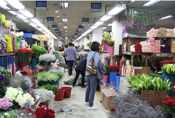 鮮花市場靠近盆花銷售區(qū),面積不大,每天23:00至次日13:00營業(yè),入駐了100家左右商戶。切花以月季、百合、康乃馨、菊花等為主,都使用小格子存放花材,效果美觀。不過韓國最大的鮮切花市場位于漢城高速公路客運站旁。